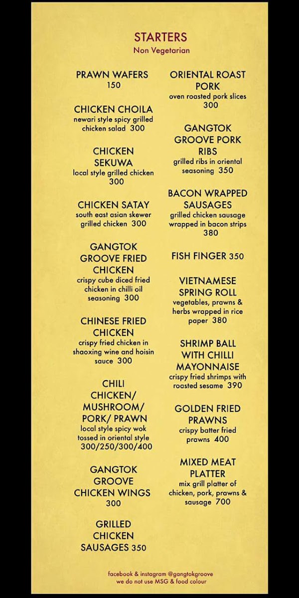 Introducing the delightful menu of Gangtok Groove, a vibrant hotspot perched above Pantaloons on Mahatma Gandhi Marg, Gangtok. This restaurant bar merges a lively atmosphere with a rooftop setting, perfect for unwinding or celebrating special moments. Guests rave about the pork starters, described as a must-try, and a diverse selection of alcoholic beverages caters to all palates.